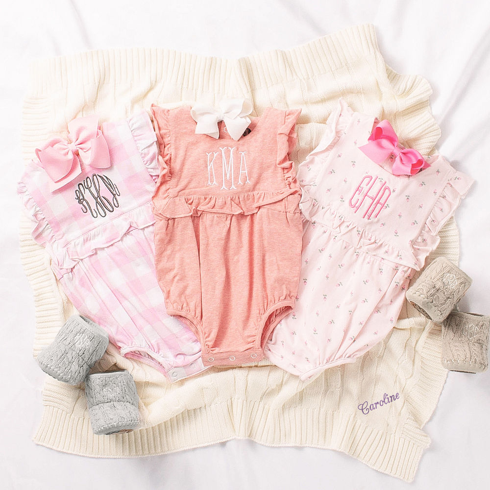 From the top of their sweet-smelling heads to the tips of their little piggies, Marleylilly Kids has your beautiful baby covered. Shop infant boys’ and girls’ monogrammed clothing options. From monogrammed onesies, monogrammed baby shirts to gowns, rompers, and swimwear, our selection of Marleylilly Kids Baby is a not-to-miss site for new moms, dads — and proud grandparents, too. We even offer monogrammed baby blankets, monogrammed baby bibs, and monogrammed lovies, which — by the way — make fabulous heirloom-worthy baby shower gifts.